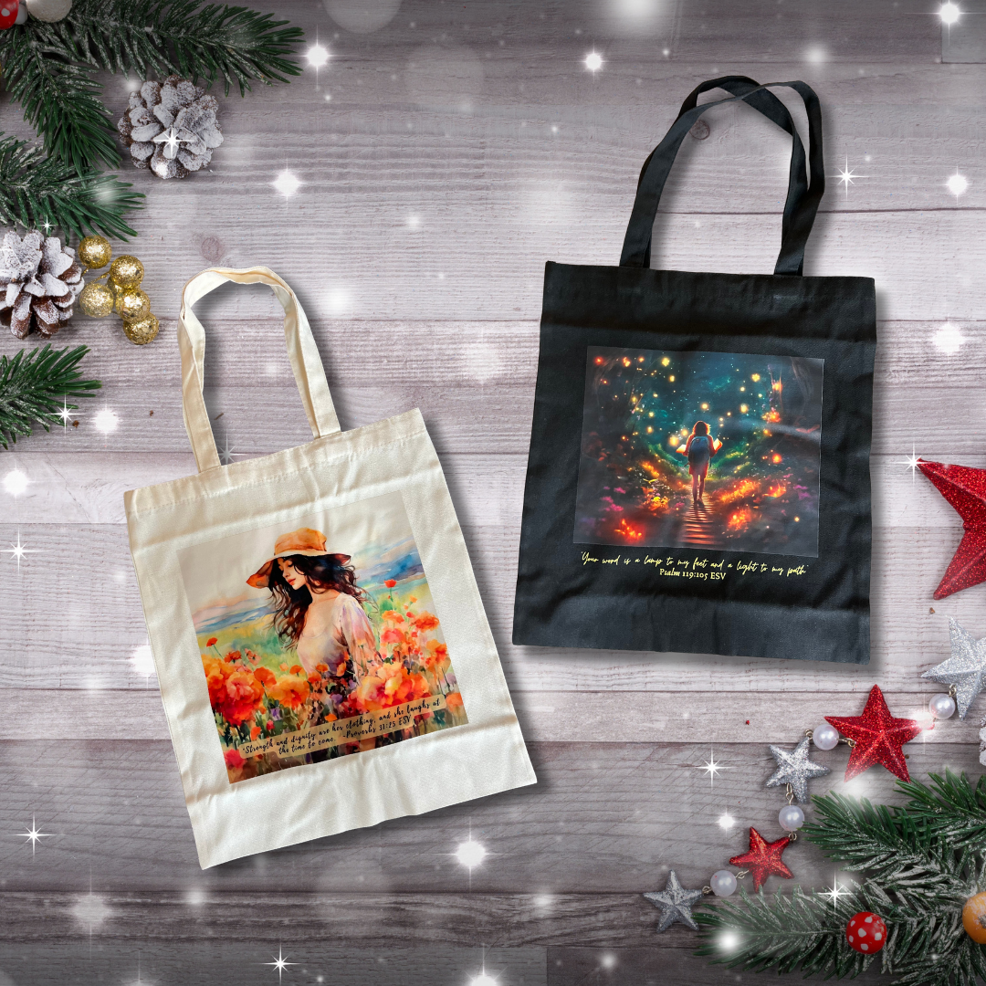 This black tote offers a striking night scene filled with rich color and depth. It displays the verse from Psalm 119:105, which makes it both practical and encouraging.